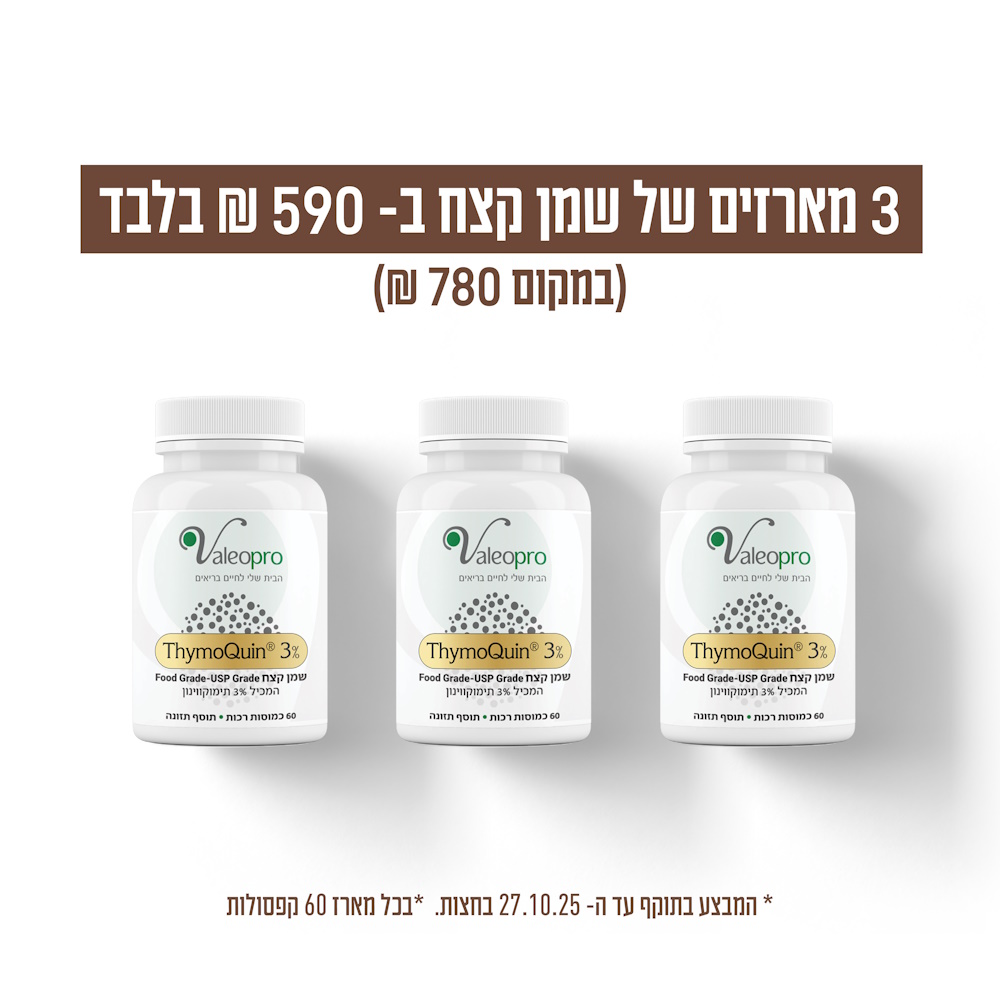 על בסיס מחקרים אלה, יוצר תוסף ,ThymoQuin3% המבוסס על שמן הקצח הייחודי, בתוספת 1000 יחב"ל של ויטמין -D החשוב מאוד למרבית האוכלוסייה בישראל במיוחד כעת בשנים שלאח:ר מגפת הקורונה.